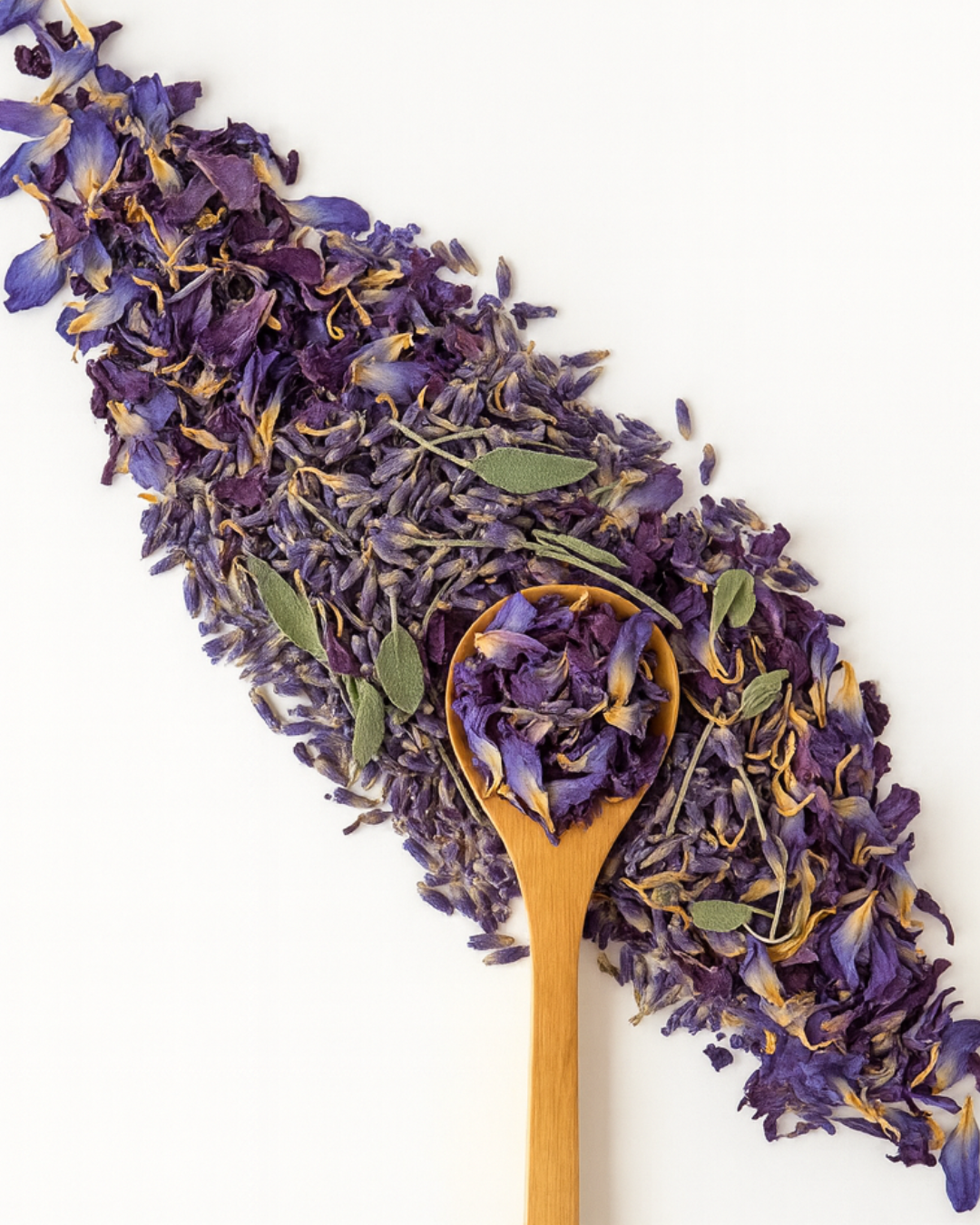 A soothing herbal blend of blue lotus, wild sage, and French lavender, thoughtfully crafted to ease stress, encourage deep, restful sleep, and inspire vivid dreams for a peaceful, refreshed awakening.